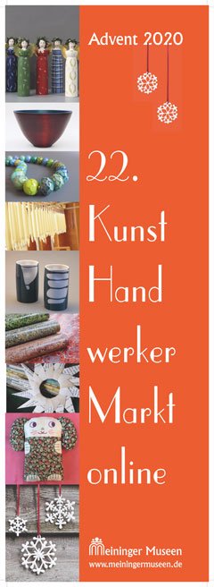 Mit der dankenswerten Unterstützung von Buchhandlung Lohmann, Floristik-Galerie Elena Pecher und Däumeling & Däumelinchen können Sie in der Meininger Innenstadt eine Auswahl des diesjährigen Angebotes an Kunsthandwerk und modernem Design direkt kaufen (siehe Hinweis *). Damit geht auch die Erfahrung des ‚Offline-Shoppens’ nicht gänzlich verloren.